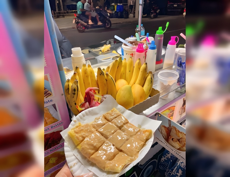 Popular street food in Thailand. It involves making a thin, flatbread (roti) that is filled with sliced bananas and often drizzled with condensed milk or chocolate syrup.
