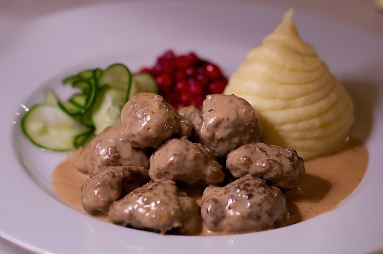 Swedish meatballs, which are made from ground meat, often a mixture of beef and pork, seasoned with ingredients like onions, breadcrumbs, and spices. These meatballs are typically small, round, and are traditionally served with lingonberry sauce and creamy gravy.