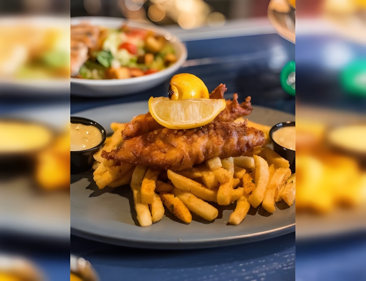Classic British dish consisting of deep-fried battered fish, commonly cod or haddock, served with thick-cut, crispy fried potatoes.