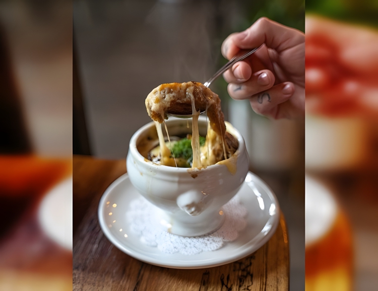 Is a classic French dish consisting of caramelized onions, beef broth, and usually a splash of red or white wine. It is often topped with a slice of baguette and melted cheese, typically Gruyère or Swiss.