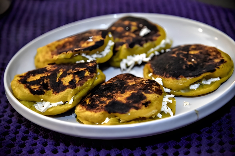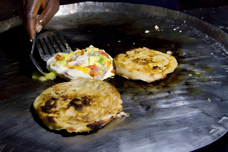 Traditional and versatile food in Latin American cuisine, particularly in Colombia and Venezuela. These flat, round cornmeal patties are often grilled, baked, or fried and can be split open to create a pocket for various fillings such as cheese, meat, avocado, or beans.
