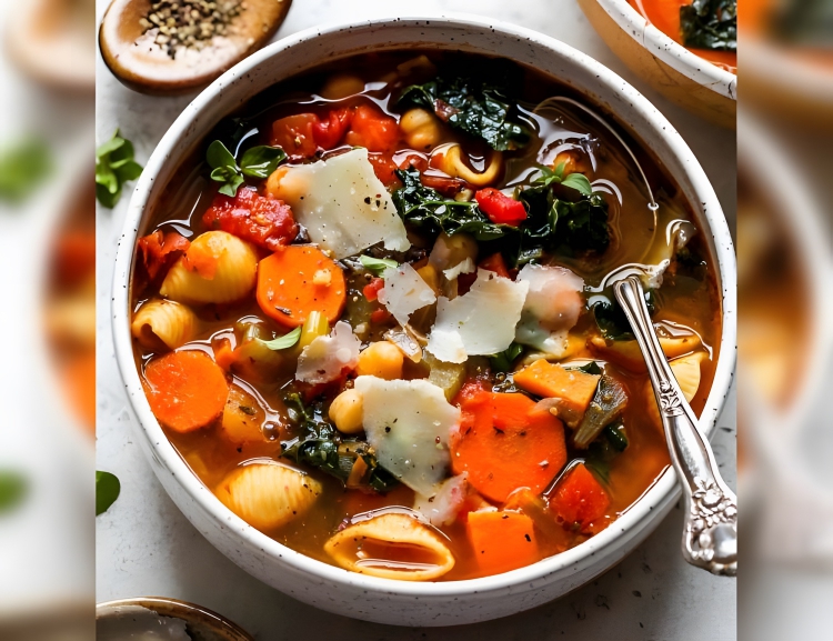 Italian vegetable soup known for its hearty and robust character. It usually contains a variety of seasonal vegetables, beans, and pasta or rice, cooked in a flavorful broth made with tomatoes and aromatic herbs. Minestrone is a versatile dish, and ingredients may vary based on regional and personal preferences.