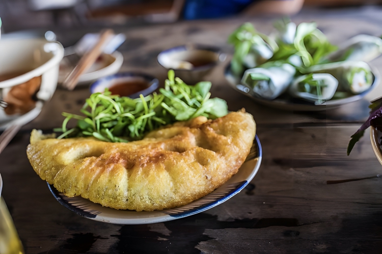 Is a Vietnamese dish known as “sizzling pancake” due to the sound it makes when the rice batter is poured into a hot skillet. It’s a savory pancake filled with a mixture of shrimp, pork, bean sprouts, and herbs. Typically, it’s served with fresh lettuce leaves and a dipping sauce, offering a delightful combination of textures and flavors.