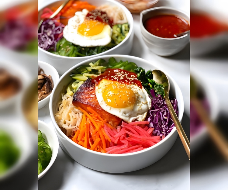 Popular Korean dish that translates to “mixed rice.” It typically consists of a bowl of steamed rice topped with an assortment of seasoned vegetables, sliced meat (commonly beef), a fried egg, and spicy gochujang (red chili paste). The dish is thoroughly mixed before eating, creating a harmonious blend of flavors and textures.