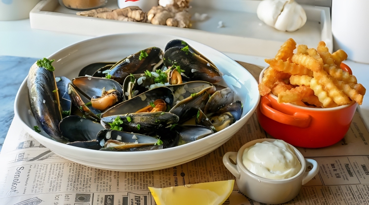 Belgian dish consisting of mussels (moules) steamed with white wine, garlic, shallots, and herbs. It is often served with a side of crispy golden fries (frites).