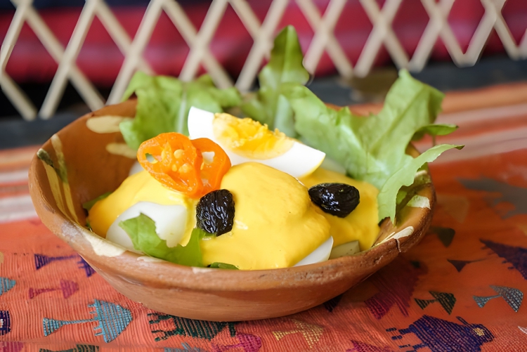 Peruvian dish featuring boiled potatoes that are sliced and covered with a spicy, creamy cheese sauce called “Huancaína.”