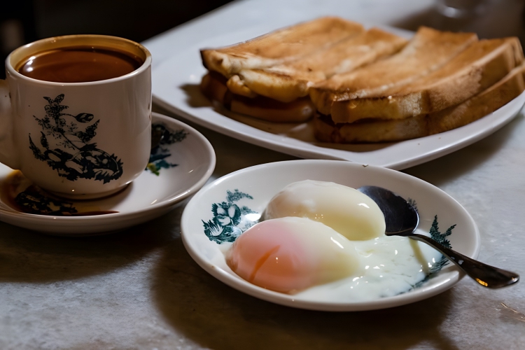Popular breakfast or snack in Singapore. It involves toasted bread spread with kaya, a sweet and creamy coconut and egg jam. The toast is often served with a generous amount of butter and paired with soft-boiled eggs seasoned with soy sauce and white pepper.
