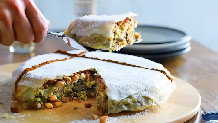Is a traditional Moroccan dish consisting of layers of thin pastry filled with a savory mixture of pigeon meat, almonds, and spices, usually topped with powdered sugar and cinnamon, creating a unique blend of sweet and savory flavors.