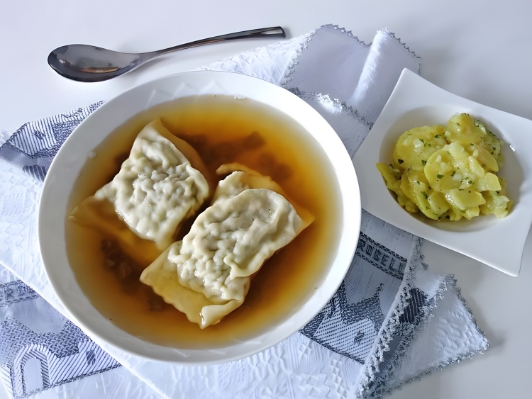German dumplings that originated in the Swabian region. These dumplings are typically large and filled with a mixture of minced meat, such as pork or beef, spinach, onions, and breadcrumbs. Maultaschen are seasoned with herbs and spices, then boiled or sometimes fried.
