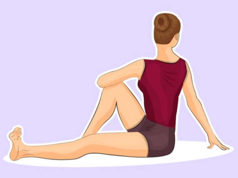 Sit down on the floor with your right leg extended to the side, your left knee bent, and the sole of your left foot near your inner right thigh. Grab your right foot with both hands as you stoop to your right side. Switch sides after 60 seconds of holding.