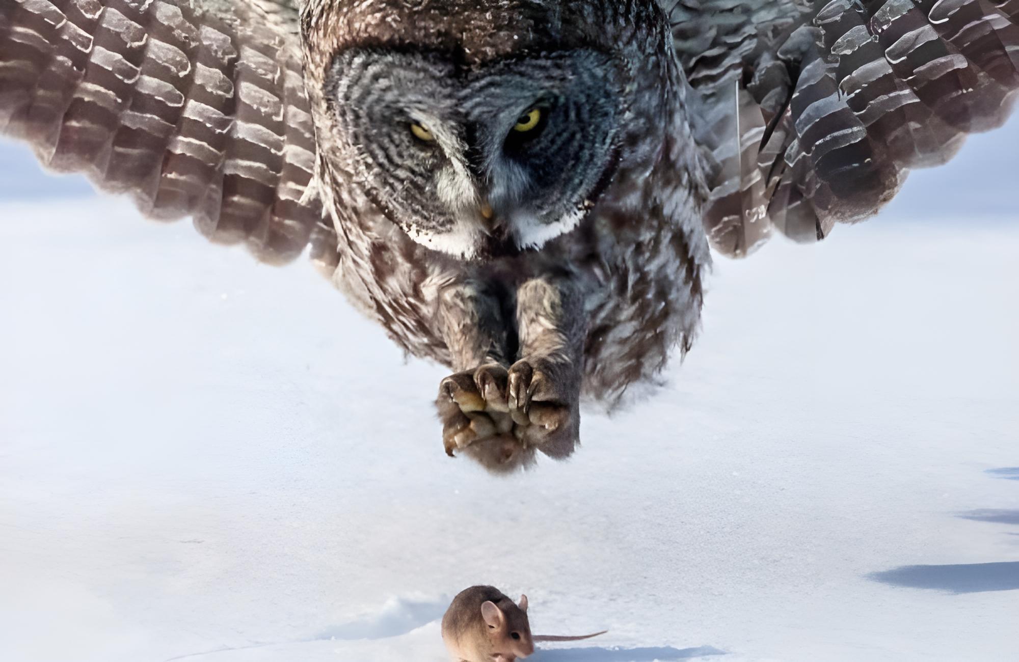 This photograph of an owl almost ready to grab the tiny mouse elicits many emotions. One can almost feel the power and glory of the owl through the screen, as well as the terror that the mouse might feel in a while.