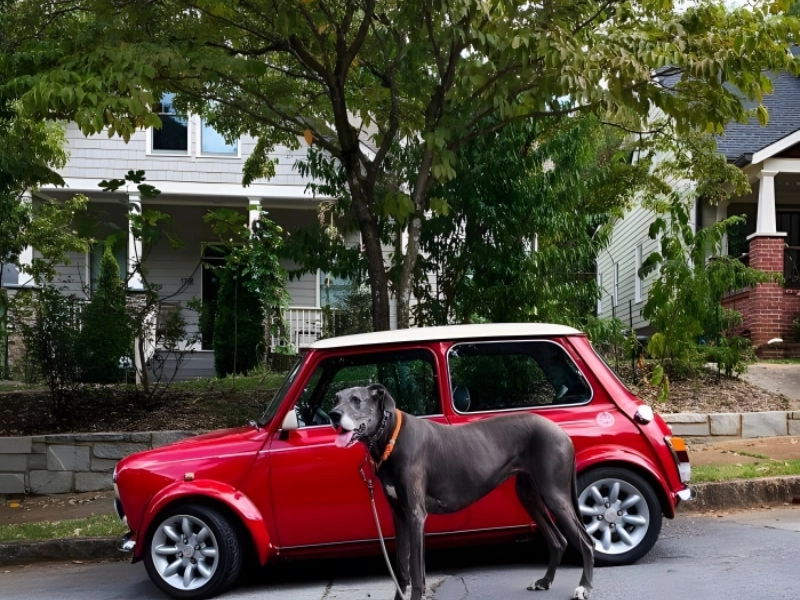 This is what one looks like next to a Mini Cooper in case you required a better size reference for a Great Dane. Bella here loves pointing her head out of the small car window. She fits in there even though she appears like a horse compared to the little car.