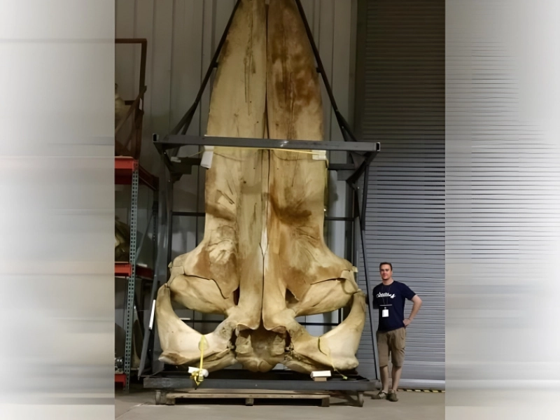 Its skull alone allows one to picture the size of the remainder of the animal. Comparatively to the skeleton, the man resembles a small mouse. Blue whales are indeed so big that their hearts by themselves weigh as much as a vehicle.