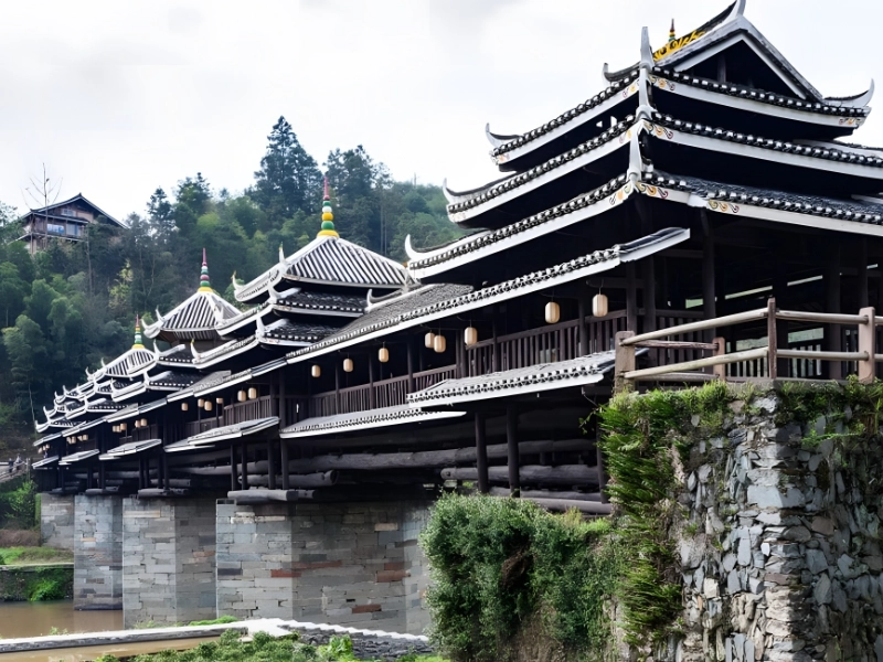 The bridge has three spans and is only 211 feet long. It stands 33 feet tall. The Wind-Rain Bridge, another name for the covered bridge, is a stunning tourist destination. The bridge’s top structures are composed of wood, and the roof is tiled. It features three stories, five pavilions, nineteen verandas, and three piers.