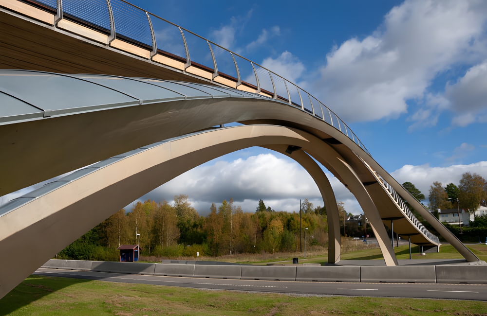 The Da Vinci Bridge is part of the larger Vebjorn Sand da Vinci Project. The Bridge is a parabolic-arch, laminated-wood pedestrian bridge that crosses over Route E18 in Norway. Artist Vebjorn Sand and the Norwegian Public Roads Administration partnered to create this feat, which was partially based on designs by Leonardo Da Vinci himself.