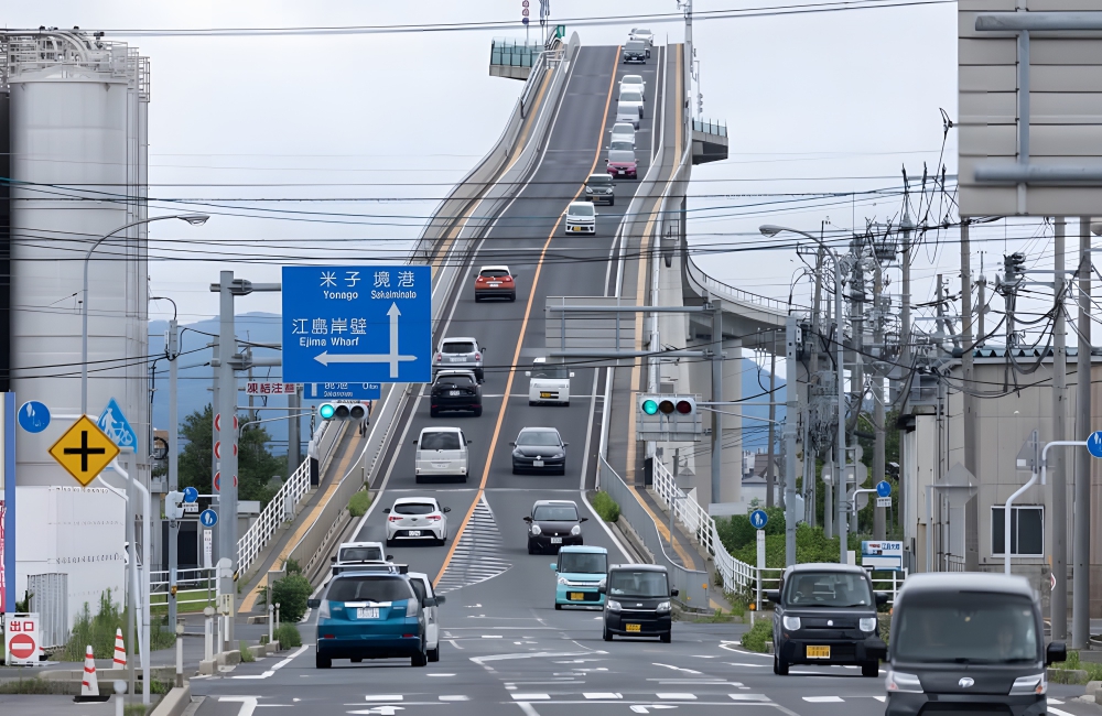 The reason for the steepness is to allow larger ships to more easily pass under the roadway. However, the Bridge actually has just a 6.1% gradient on one side and an even less-steep 5.1% gradient on the other, making it a unique optical illusion. Eshima Ohashi is 1.06 miles long and 147 feet in height. It cost