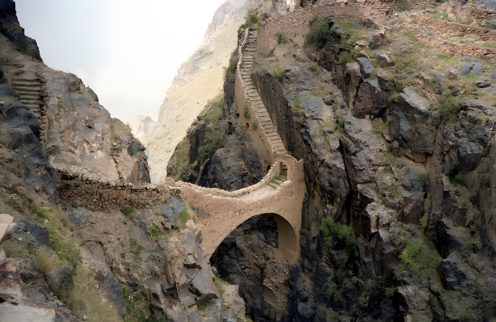 The Shaharah Bridge is located in the Ahnum Mountain Range in Yemen, about eighty-seven miles from the country’s capital city of Sana’a. The Shaharah connects the Jabal al Faish and the Jabal al Emir, stretching across the canyon that spans the two mountains. The Shaharah clears 300 feet, and it stretches 65 feet.