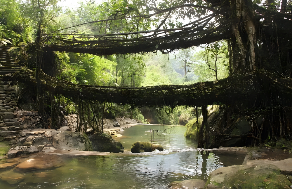 Living root bridges are types of simple suspension bridges. They are formed by tree-shaping, which is a practice of guiding the roots of a tree (usually Ficus elastica) across a river or stream. Then, you wait, allowing the roots to strengthen and grow over time. It can take decades before a living root bridge is able to hold human weight.