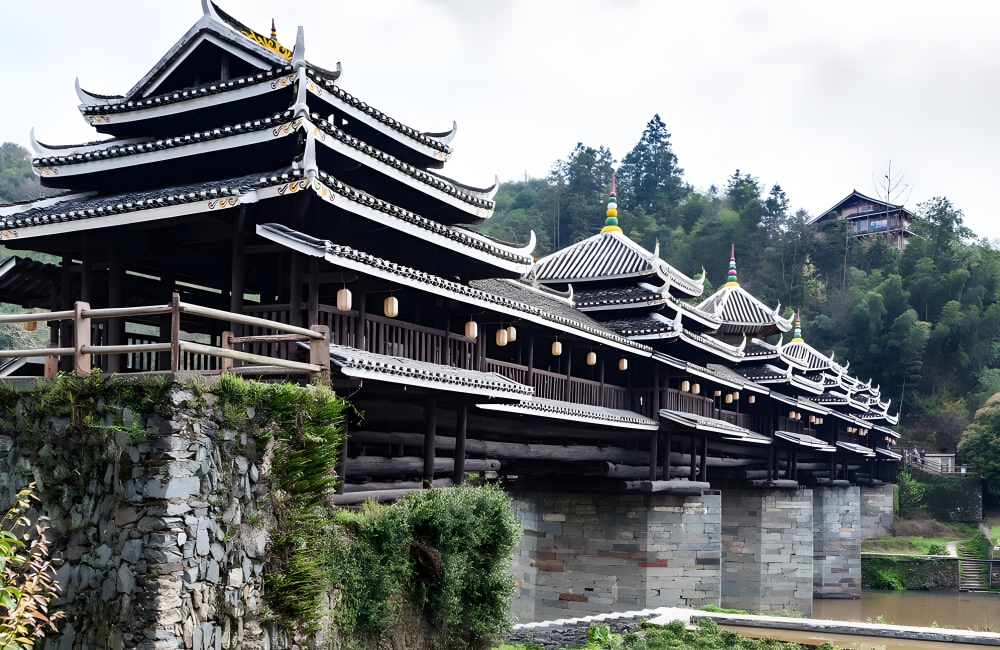 The three-span bridge is short, stretching just 211 feet. It is 33 feet tall. The covered bridge is known also as the Wind-Rain Bridge, and it is a beautiful tourist attraction. The roof is covered in tiles, and the bridge’s upper structures are made of wood. It has three piers, five pavilions, three floors, and nineteen verandas.