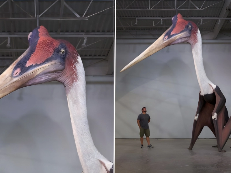 Unknown circumstances lead one to believe that the largest known flying animal is an ostrich-like creature. When you see this image of a model Quetzalcoatlus Northropi standing next to a man, you might assume that the man is a dwarf because nobody can imagine an animal with the wingspan of a small airplane. However, it is untrue—the man is a typical individual who stands 1.8 meters tall.