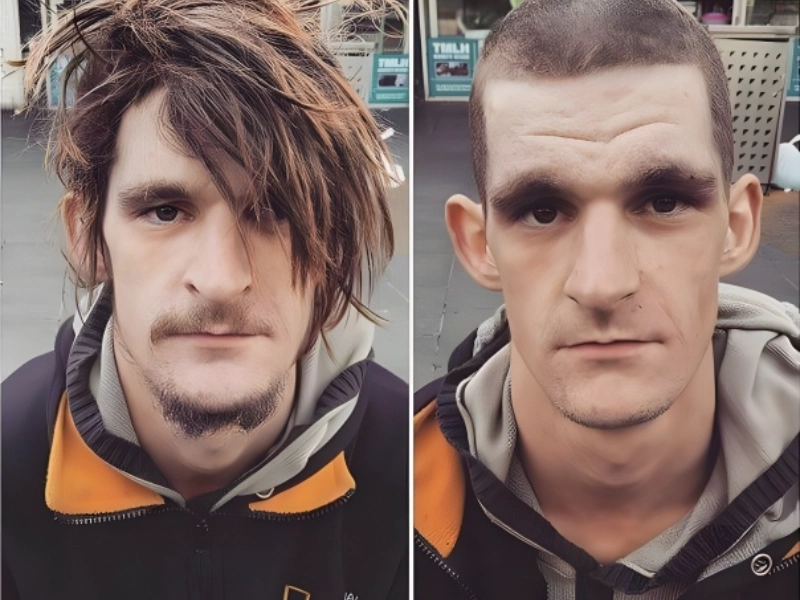 Nasir Sobhani’s reputation as “The Street Barber” is acquired from his commitment to serving others in need. Although he is well-known for designing elegant haircuts for his business, he knows sometimes the most powerful change results from simplicity. This specific scenario shows his capacity to modify his abilities to fit every necessity. A basic buzzcut paired with the elimination of the man’s moustache, beard, and long hair produced a striking metamorphosis. The simplicity of the cut betrays its impact; the man’s appearance was transformed not only by the clean, low-maintenance style but also by one that would be simpler to keep while living on the streets. This metamorphosis shows how much look and self-image could change with even the most basic grooming treatments. According to Nasir’s work, a haircut’s significance goes much beyond its professional execution; it’s about giving people most in need dignity and humanity.