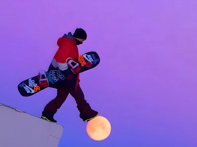 Este snowboarder parece estar dando un “acto de fe” al pisar la luna en un momento similar al viaje de Indian Jones a través del puente al final de The Last Crusade. Nos referiríamos a eso como “un salto gigante”.