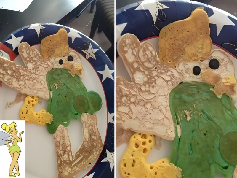 Nevertheless, it’s not a simple task to turn Tinkerbell into a baked product, especially not for this baker. This Tinkerbell pancake isn’t so much a cute fairytale creature as it is a malformed duck. The only things that identify her are the green outfit and the “wings.”