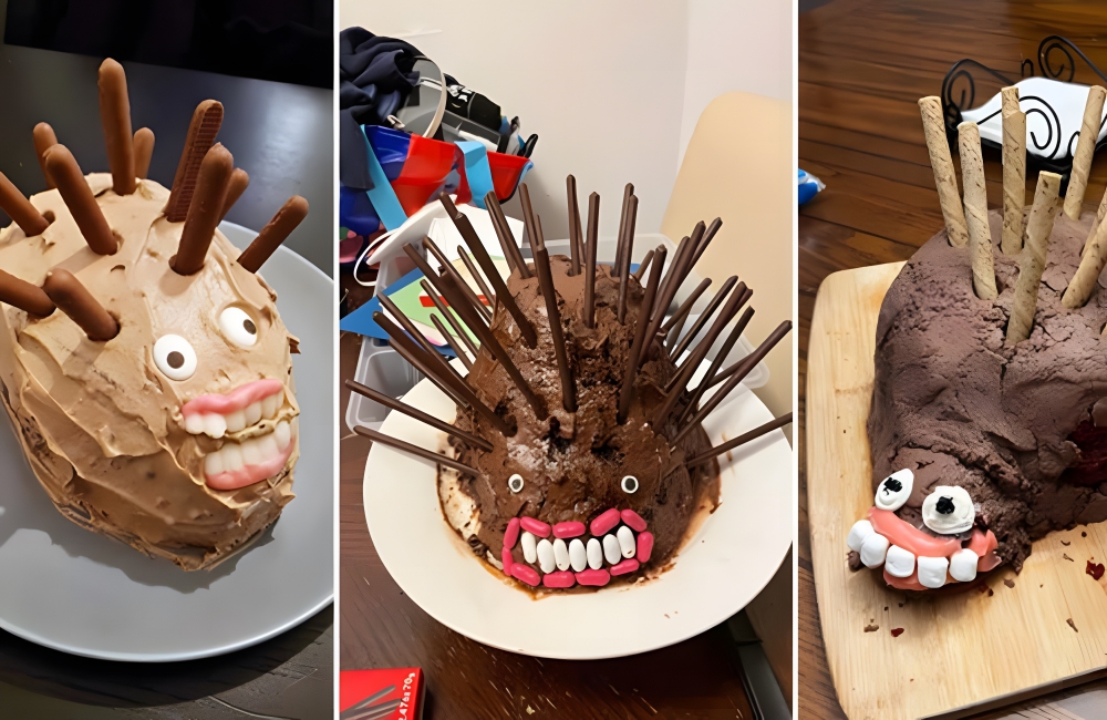 Here are a trio of hedgehog cake fails, each more hilarious than the other. This “celebration cake with a woodland style,” as BBC described it, took a dark turn for these bakers, whose creations look like they came out of Five Nights At Freddy’s.