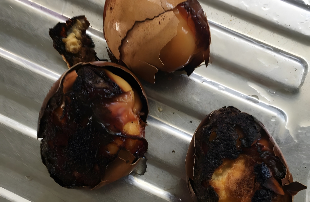 This might’ve happened from not paying attention. This person could’ve put boiled eggs on the stove, forgot about them, and then only remembered when the water evaporated and the eggs began to “roast” at the bottom of the pot. Yikes.