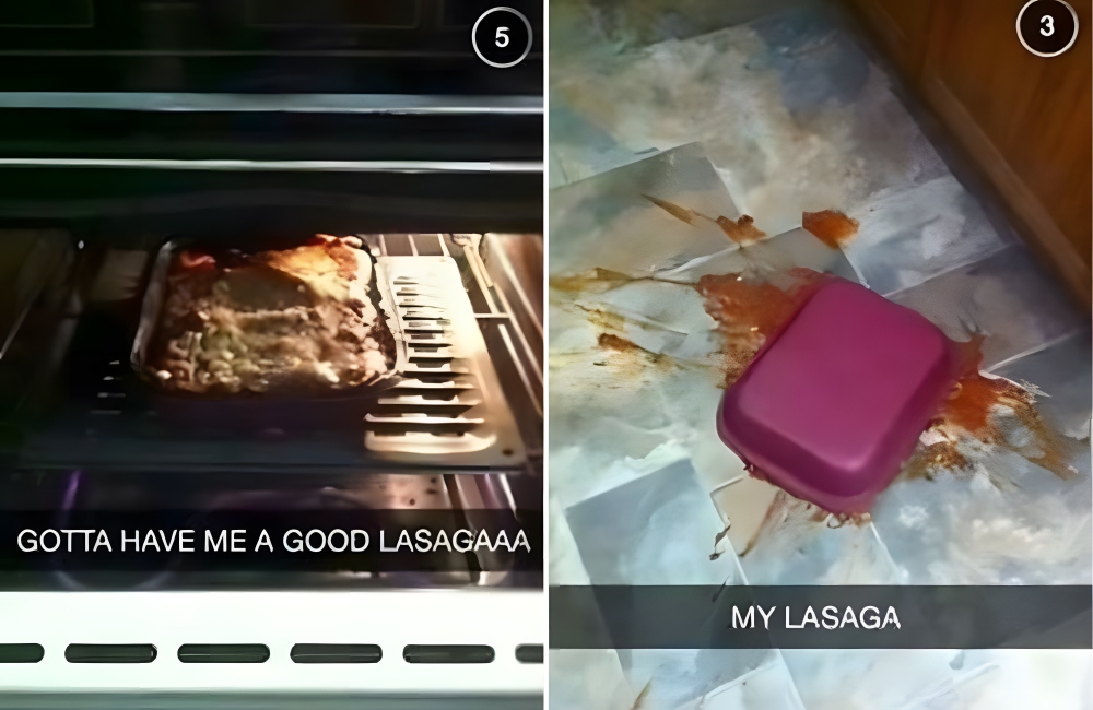 And then…Act II: “MY LASAGA” posted over a picture of the lasagna, face-down, on the ground. Someone got too excited to make lasagna, and they forgot how to spell, as well as how to take something out of the oven.