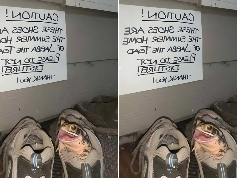 Jabba the toad has a similar tale, but he was fortunate enough to find safety in the home of kind individuals who not only gave the toad a pair of old shoes to live in permanently but also erected a heartfelt sign warning anyone who attempted to tamper with the arrangement—intentionally or unintentionally. The toad can hardly hold its smile in this picture, which perfectly captures how delighted it seems at this morally just act of human kindness!