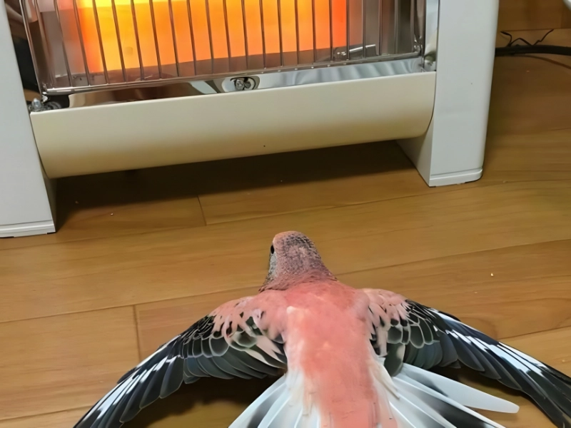 Thus, this cute bird took full advantage of the chance to feel the warmth of a space heater by spreading out its glitzy wings in the light and dozing off. Birds need warmth too, no matter how many feathers they have!