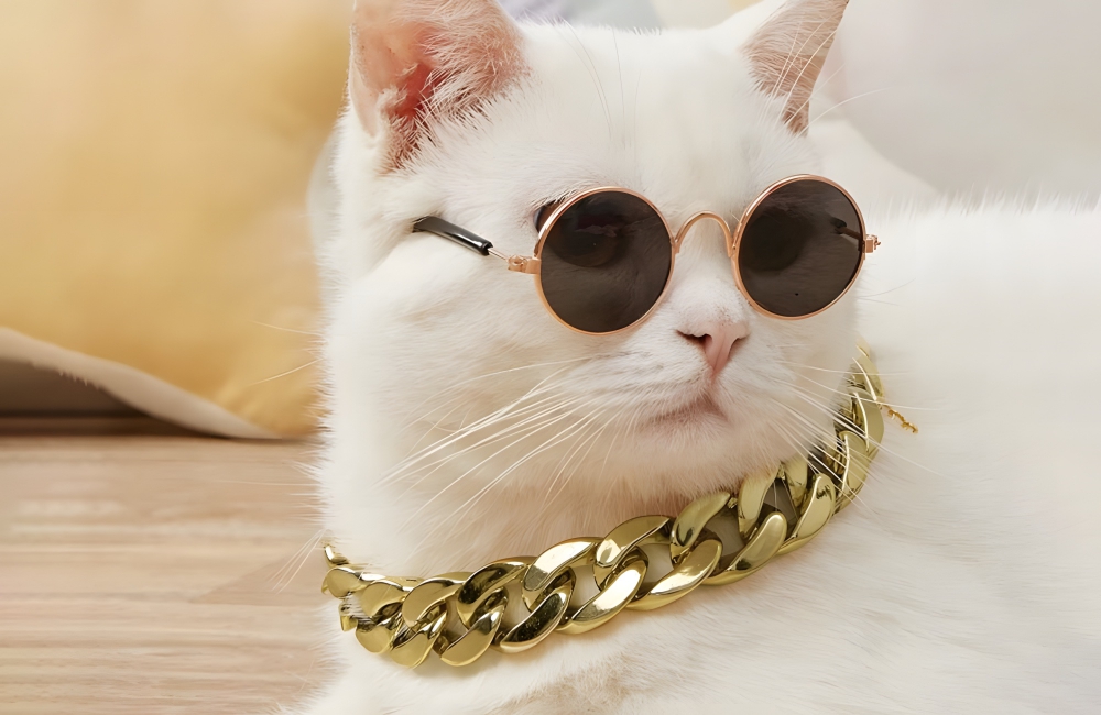 This $4.50 two-piece set consists of sunglasses and a gold, faux-Cuban-link chain. It comes in one size, and the glasses and necklace are fitted perfectly for our feline friends. On the Shein website, the cat accessory set has a 4.8/5-star rating from people who somehow convinced their cats to let their owners put the glasses and necklace on them.