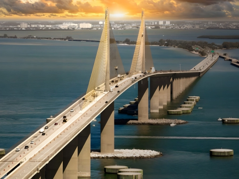 The Sunshine Skyway Bridge is a stunning example of modern architecture and engineering, spanning 6.7 kilometers over Tampa Bay in Florida. This $244 million cable-stayed bridge was built in 1987 and is well-known for its elegant design as well as the brilliant yellow support cables that contrast sharply with the blue Florida skies.