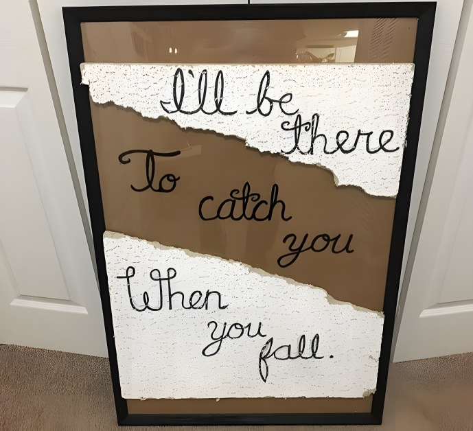 This creative hero has successfully managed to turn a tragedy into a comedy with this on-the-nail gift for their father. During an accident involving the Dad falling through their home’s ceiling, the gift-giver managed to catch him! We’re unsure whether the ordeal produced any injuries, but the light in this story comes with the gift pictured here. The gift-giver collected the debris to create this Pinterest-worthy present. Yes, what you’re looking at are bits of the collapsed ceiling!