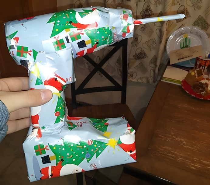 No, this is not a drill. But you would be forgiven for thinking that it was! Instead, this is a metal straw, mini-board game, moisturizer, and a toilet roll tube. These gag gifts have been dubbed ‘what-it’s-not’ presents. Following in this mastermind’s footsteps, here are a couple of other ways to create a similar prank: you could use a piece of cardboard cut out into the shape of a saucepan. Then, fill it with actual presents!