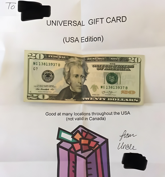If you’re in a hurry, take note (literally) of this uncle’s fun gift idea. This recipient’s uncle has gifted them the same Christmas present for years, and it still makes them chuckle every time – and for a good reason. This hilarious gift certainly made us crack a smile! This uncle has created a ‘universal gift card’ – which, as you can see, is just a $20 bill taped to a bit of paper.