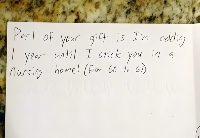 Part of this 11-year-old child’s Christmas present is that they’ve decided to add one year on to the age they’ll put their parents in a nursing home. Let’s just hope it isn’t a luxury, full-board residential village boasting a pool, gym, and golf buggies; otherwise, we would happily be there tomorrow! For those with a darker sense of humor, this could go down fabulously as a note on a card or gift tag.