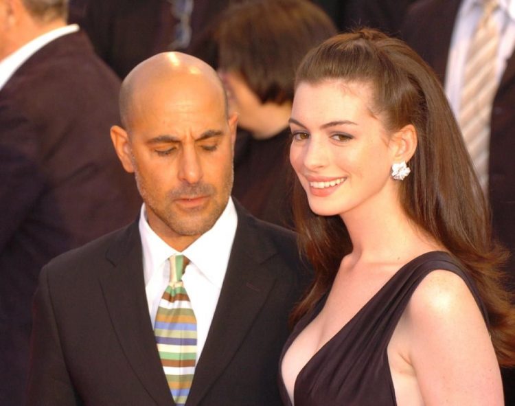 Stanley Tucci is trying to figure out what Anne Hathaway’s breast size is.
