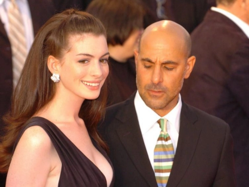 Stanley Tucci is attempting to determine Anne Hathaway’s bust size.