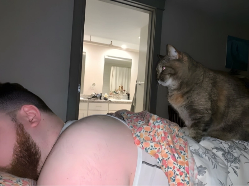 This looks more like something a dog would do, although this cat is somewhat deviating from normal cat norms. He is staring, showing his dad awake to bring him breakfast.