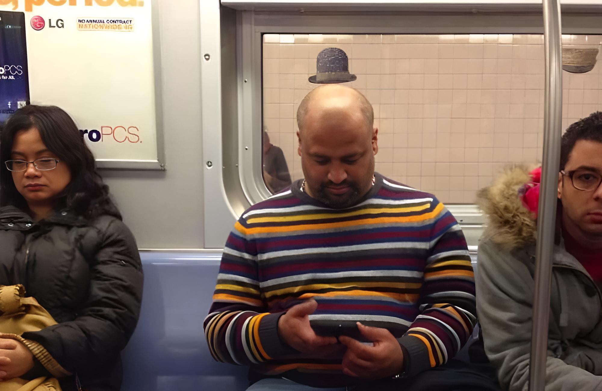 Another well-timed shot is this one, which makes the passenger look as though he is wearing a tiny hat. While he doesn’t seem to notice someone snapping a quick pic, the guy next to him sees it and is no doubt wondering what this subway photographer is doing.
