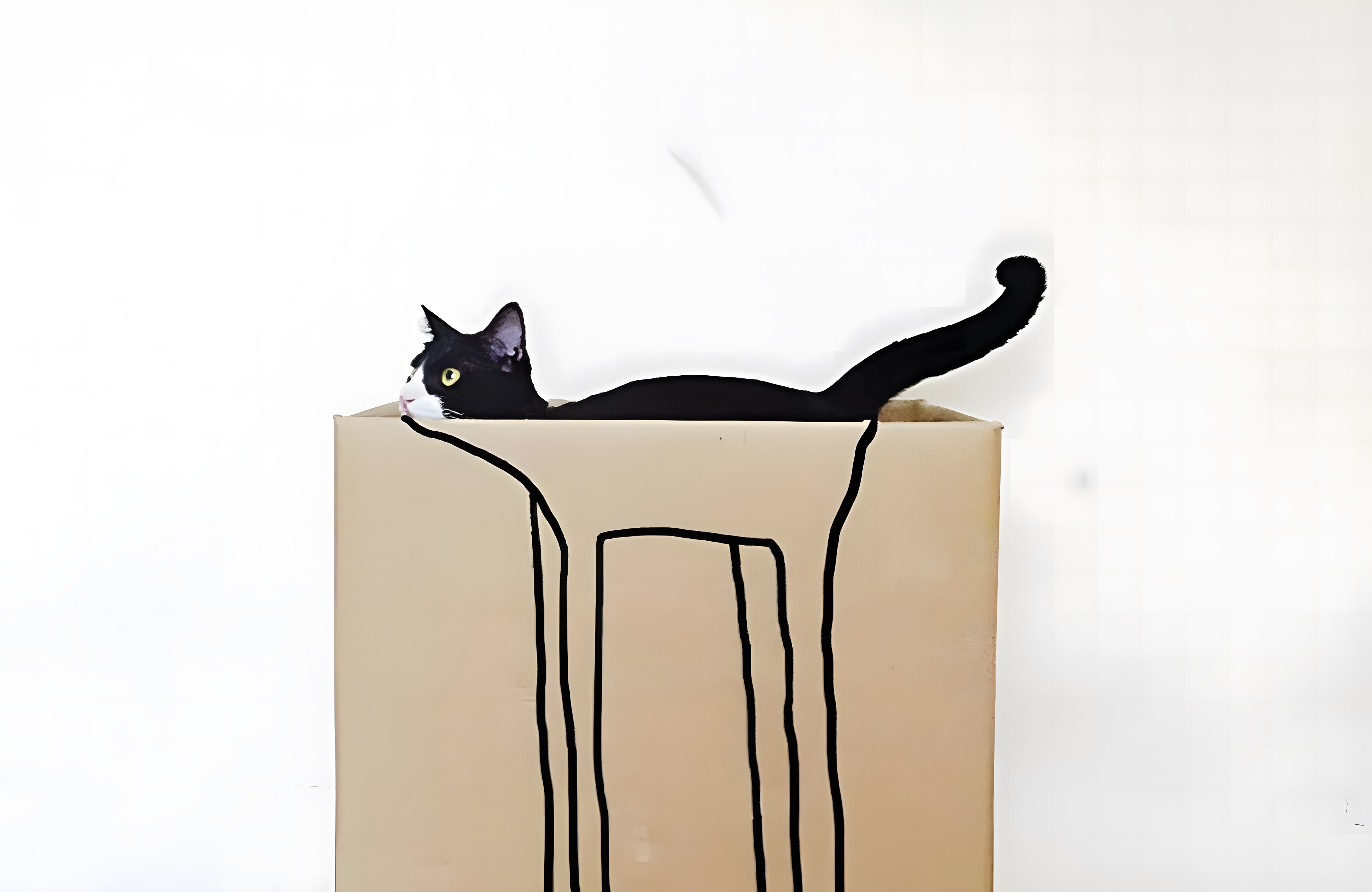 Introducing a new animal: Kitty Long Legs. This optical illusion photograph was taken against a white background, and the cat in question was in a place that cats love—a cardboard box. The exterior of the box had a silhouette drawn on it, and, when the cat hopped into the right position, he became Kitty Long Legs.