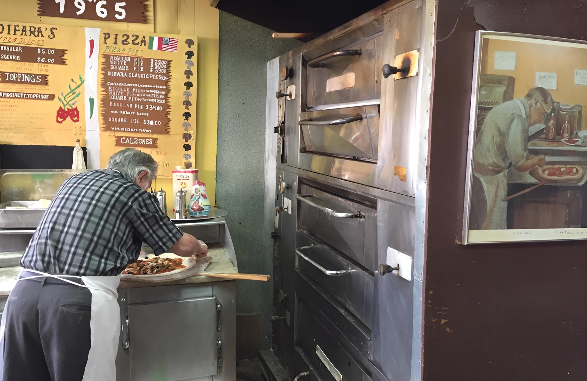 You can probably tell just from the vibe of the place, but Di Fara is delicious. Domenico DeMarco, pictured here, had been hand-making pizzas with top-quality ingredients (sweet tomato sauce, imported cheese, fresh basil and olive oil, etc.) and a careful hand for years until his passing in 2022.