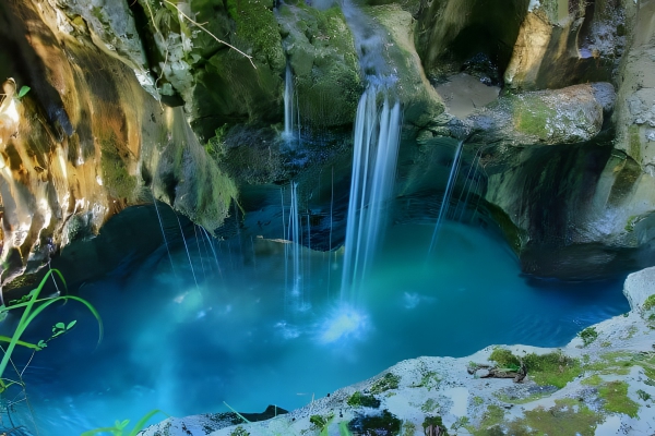 The pool itself is a stunning sight, with a 50-foot waterfall cascading over limestone outcroppings into a jade-green pool below. The grotto’s dome-like structure, partially collapsed, creates a cathedral-like atmosphere, with sunlight filtering through the opening and vines hanging from the rim, adding to the ethereal beauty of the site. The pool is surrounded by steep limestone cliffs, some rising to heights of up to 50 feet, which are adorned with lush vegetation, including ferns, moss, and native trees.