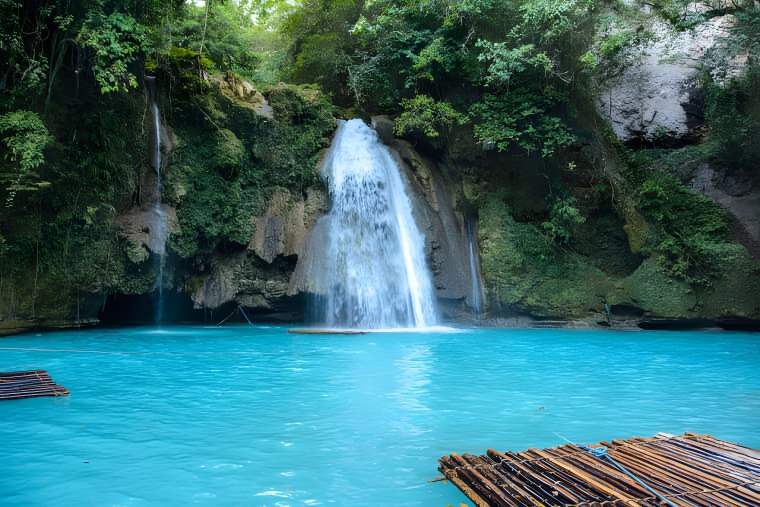 Kawasan Falls, nestled in the lush tropical forests of Cebu Island in the Philippines, is a natural wonder that exemplifies the raw beauty and serene majesty of the country’s landscapes. This multi-tiered waterfall system, with its most famous cascade dropping from a height of about 40 meters (131 feet), creates a spectacle of nature that draws visitors from around the world. The falls are renowned for their strikingly turquoise waters, a result of the high mineral content of the spring-fed stream that feeds them. This vibrant blue hue, set against the backdrop of verdant rainforest, creates a visual contrast that seems almost too perfect to be real. The main waterfall plunges into a large, natural pool that invites visitors to swim and bask in its refreshing waters. The scene is completed by smaller cascades and pools both upstream and downstream, each offering its own unique charm and opportunities for exploration.