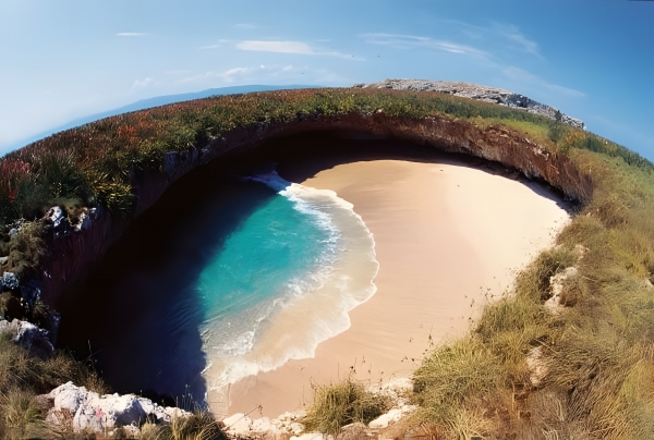 The Hidden Beach, also known as Playa del Amor (Beach of Love) or Playa Escondida, is a secluded beach located on one of the Marieta Islands, about 22 miles west of Puerto Vallarta, Mexico. As the original text states, “It is considered an idyllic paradise because it is hidden,” which is indeed an apt description of this unique and captivating natural wonder. The beach’s hidden nature is not just a figurative description but a literal one, as it is completely invisible from the outside, concealed within a large crater-like hole in one of the islands.
