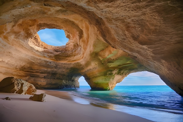 The beach itself is a stunning sight. Imagine a perfect circle of golden sand surrounded by towering rock walls, with a large hole in the “ceiling” allowing sunlight to stream in. The clear, turquoise waters of the Pacific Ocean gently lap at the shore, creating a serene and secluded paradise. The hole in the top of the cavern not only allows light to enter but also provides a unique frame for the sky above, making it seem as if you’re looking at the world through a natural skylight.