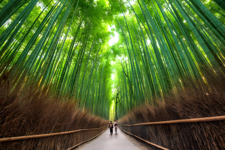 The Sagano Bamboo Forest, located in the Arashiyama district of Western Kyoto, is a natural wonder that captivates visitors with its otherworldly beauty and serene atmosphere. This enchanting grove stands as a testament to Japan’s profound connection with nature and its ability to seamlessly blend the natural world with human cultivation. As you step into the forest, you’re immediately enveloped by towering green stalks that seem to stretch endlessly towards the sky, creating a natural cathedral of bamboo. The dense growth of these majestic plants filters the sunlight, casting a soft, ethereal glow that dances across the forest floor and creates an almost magical ambiance. This interplay of light and shadow is ever-changing, offering a dynamic visual experience that shifts with the time of day and the movement of the sun across the sky. The path that winds through the forest invites visitors to wander and lose themselves in the tranquil beauty of their surroundings, providing a stark contrast to the bustling urban environments that dominate much of modern Japan.