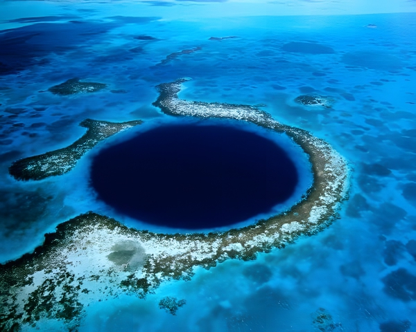 Situated near the center of Lighthouse Reef, about 70 kilometers (43 miles) from the mainland of Belize, the Great Blue Hole is part of the larger Belize Barrier Reef Reserve System, a UNESCO World Heritage Site. From above, it appears as a perfect circular sapphire set in a ring of turquoise, surrounded by the lighter blues and greens of the shallow coral reef. This striking visual has made it one of the most recognizable natural features visible from space.